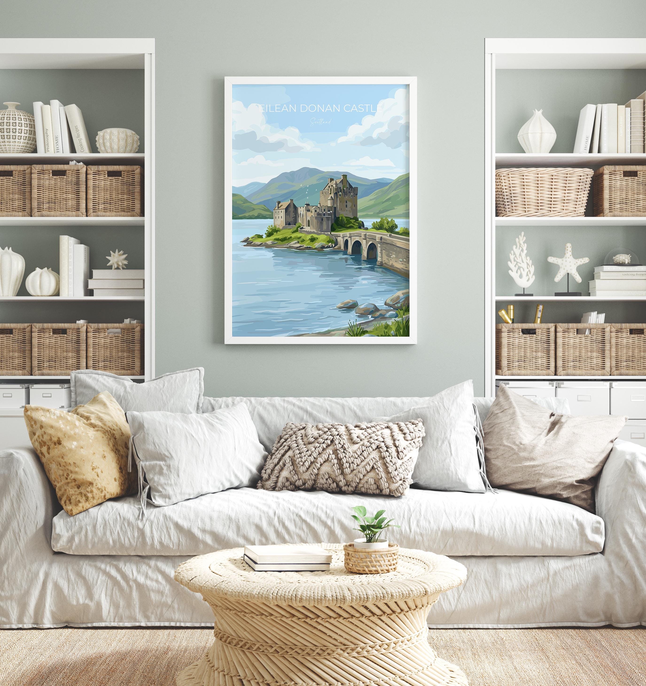 Eilean Donan Castle Scotland Travel Print, Scottish Highlands Castle Wall Art, Landscape Poster, Iconic Scotland Illustration, UK Decor