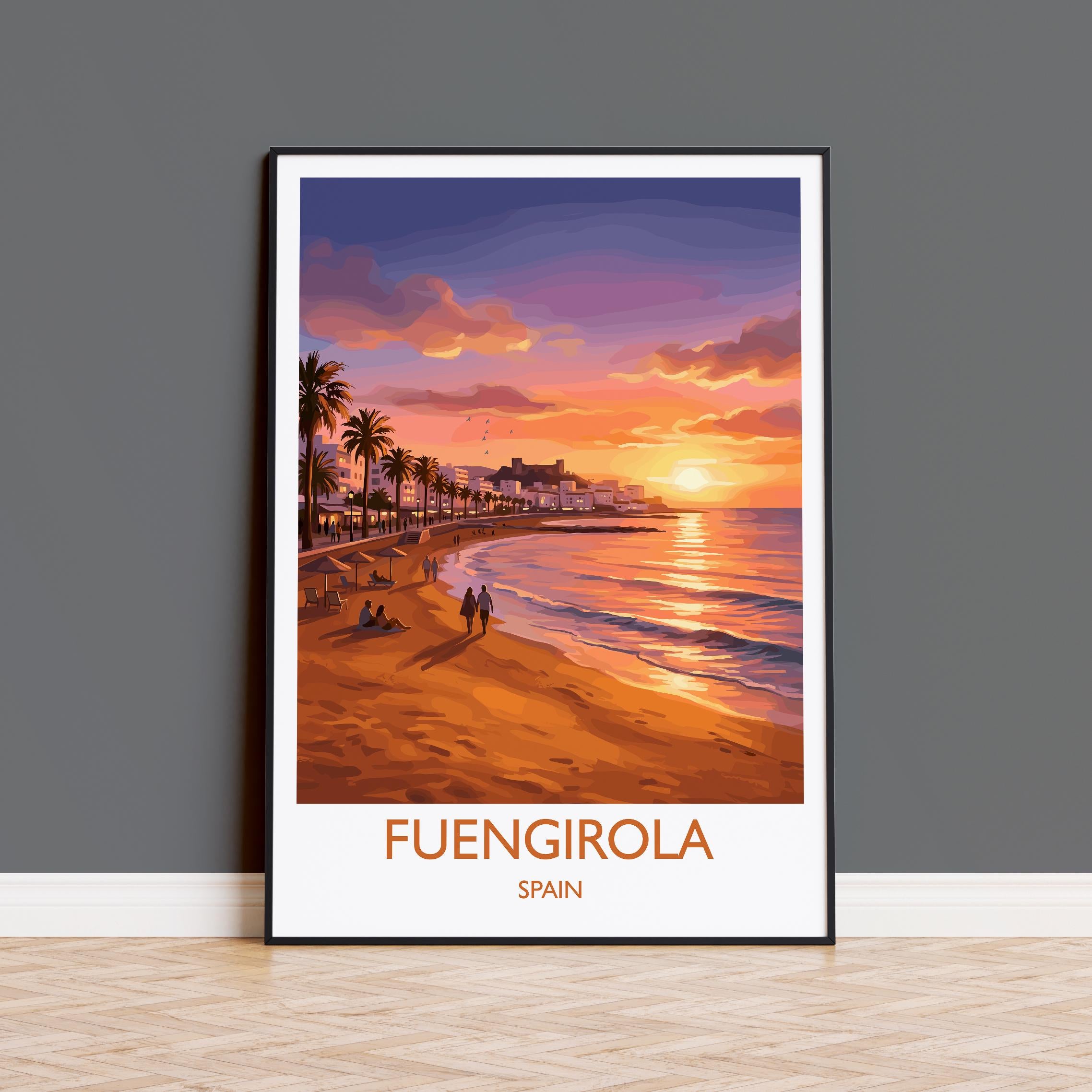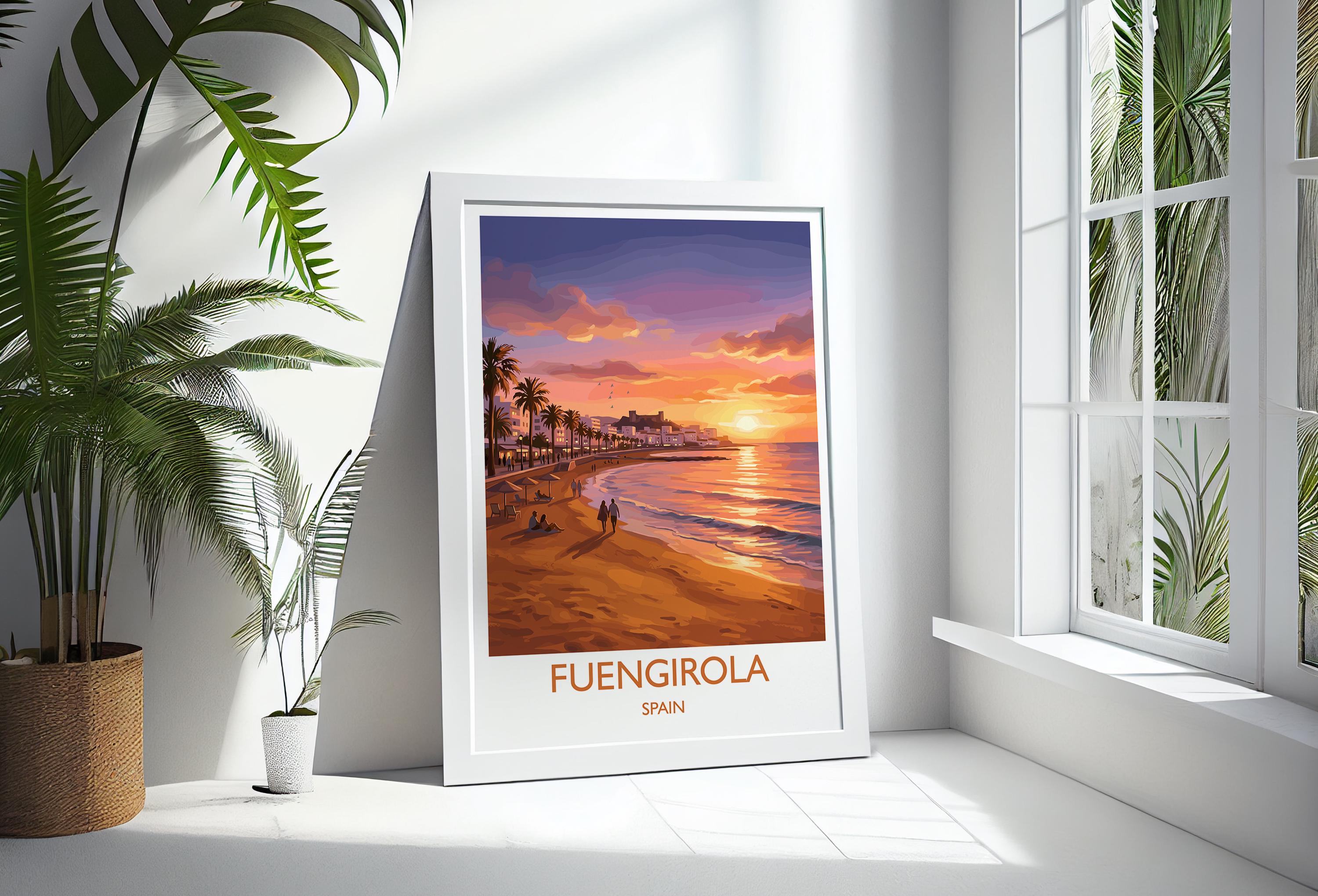Fuengirola Spain Travel Poster, Costa del Sol Beach Wall Art, Sunset Promenade Print, Spanish Coastal Illustration, Holiday Decor