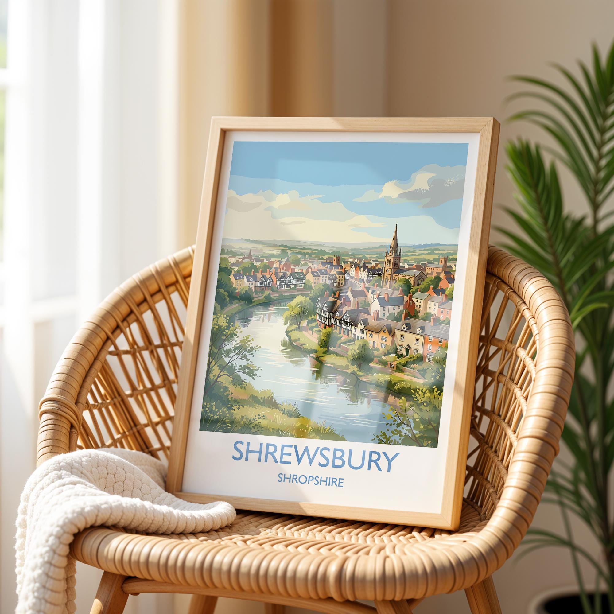 Shrewsbury Travel Poster, River Severn Wall Art, Shrewsbury Town Print, Historic Church Illustration, Shropshire Landscape, UK Decor
